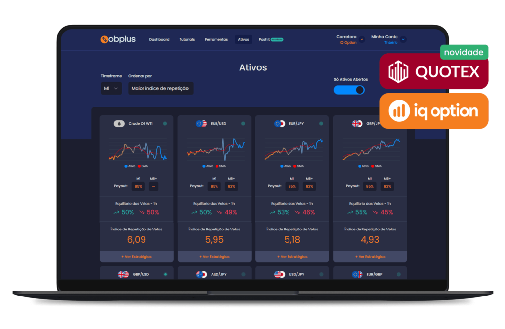 Atualmente o OBPlus utiliza a catalogação das corretoras IQ OPTION, POCKET OPTION E QUOTEX. Em breve teremos a catalogação da Olymp Trade e Binomo.