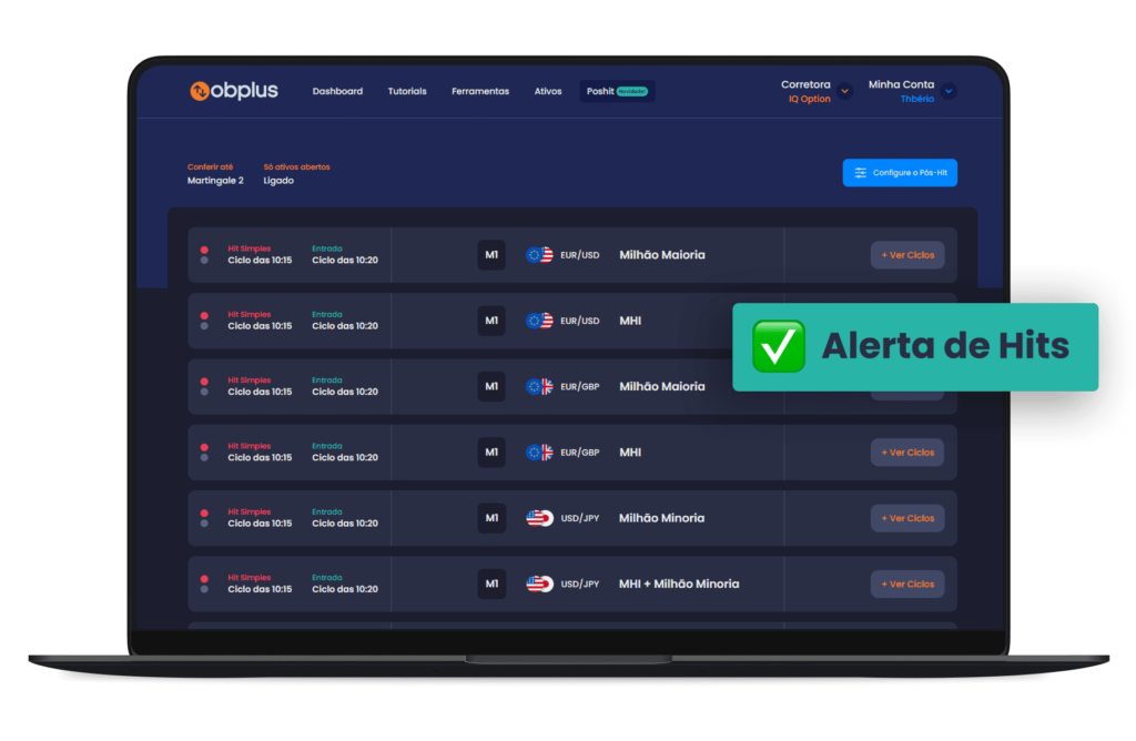 O sistema pode disparar alertas pós-hit simples e pós-hit duplo, dando a você a possibilidade de fazer uma operação no ciclo seguinte, buscando uma assertividade que gira em torno dos 90%.